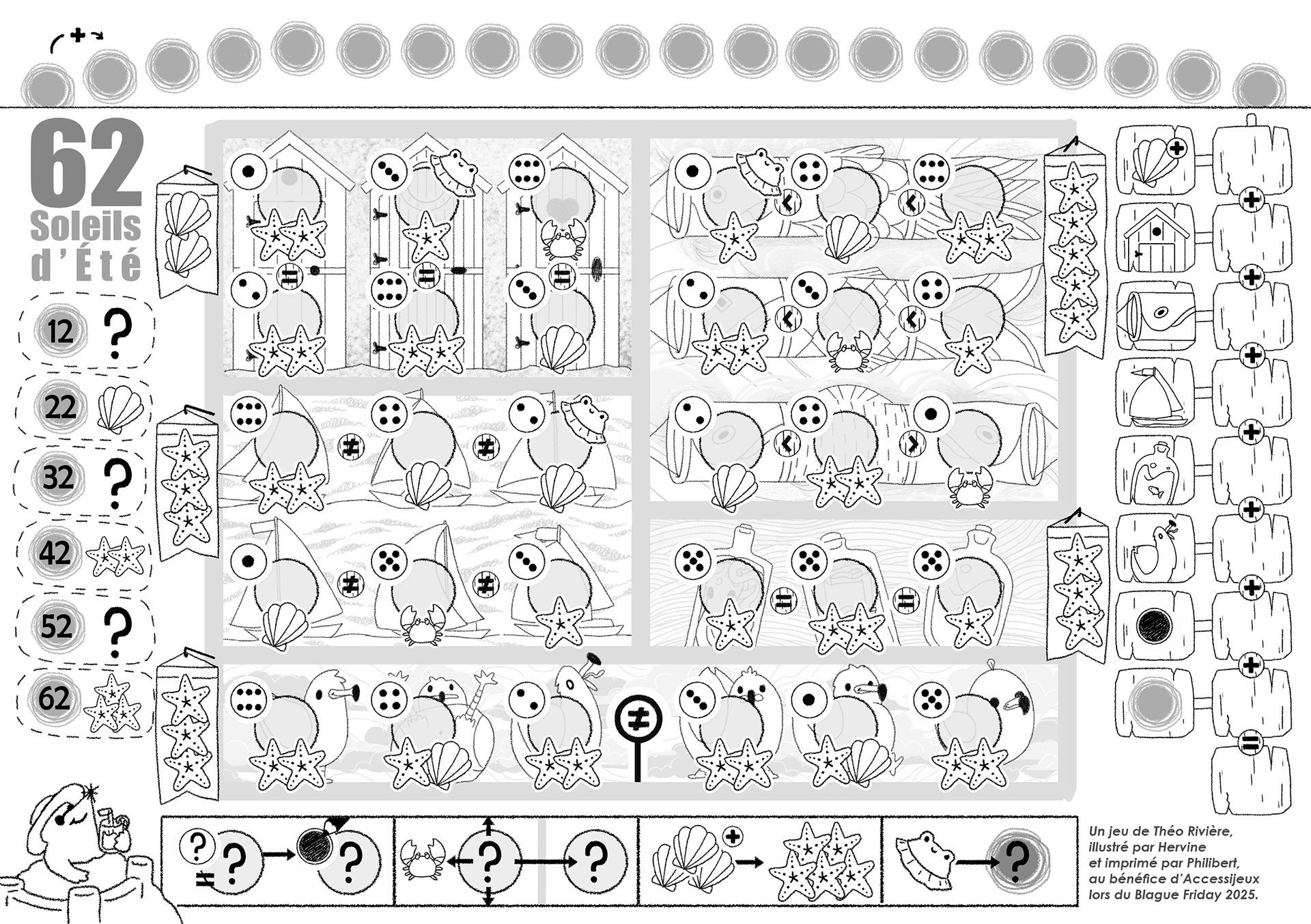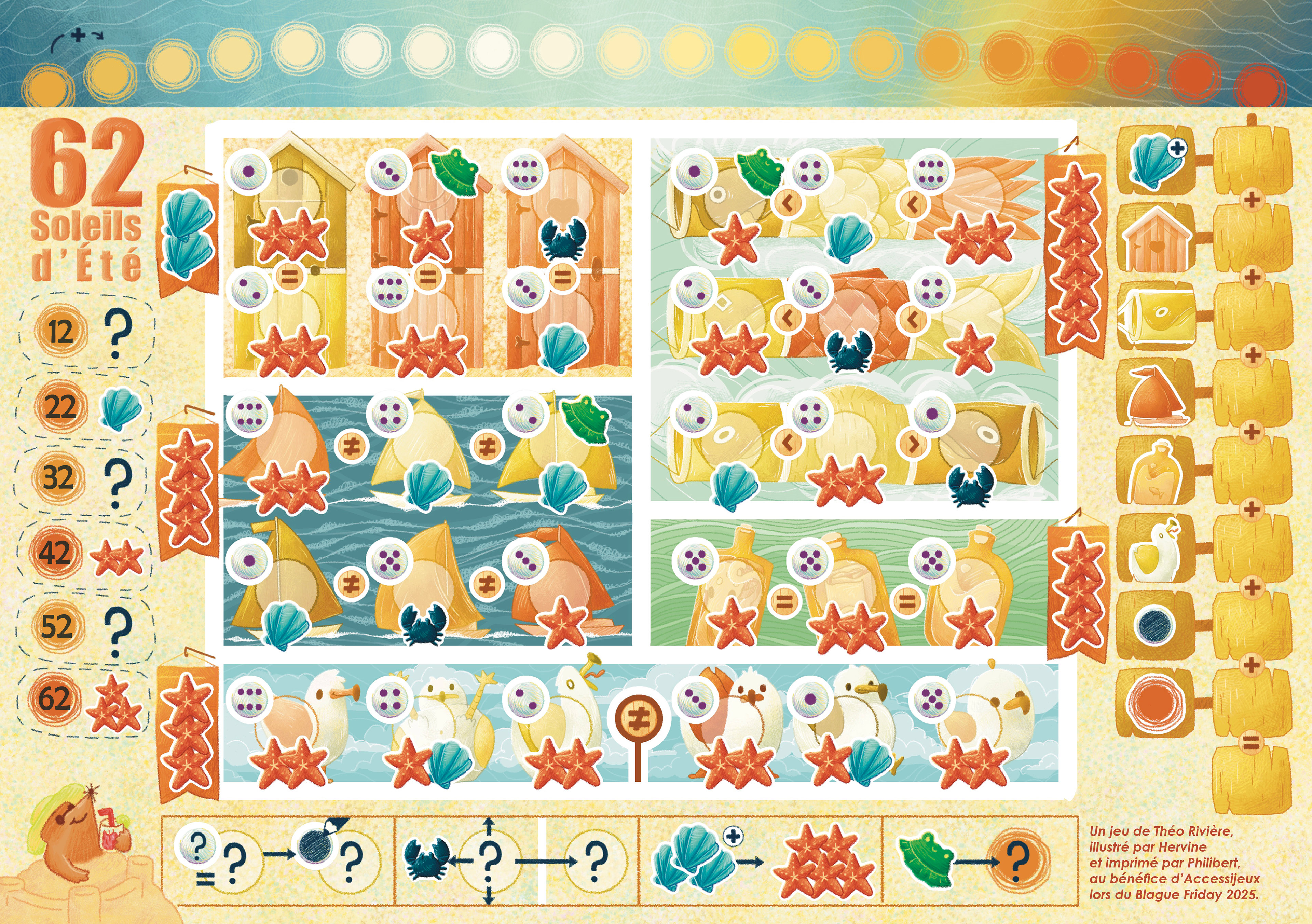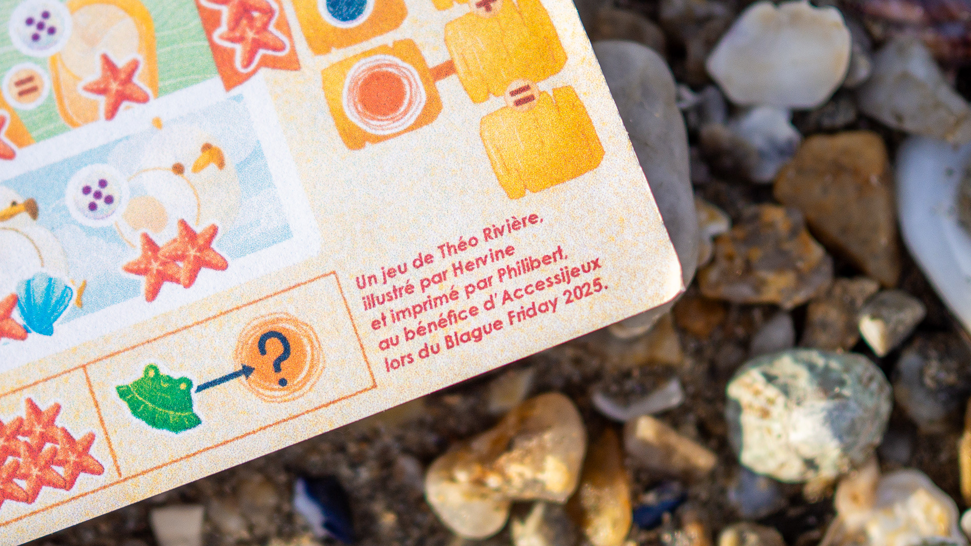 As part of their traditional Blague Friday, Philibert want, in 2025, to offer a game where all proceeds are donated to Accessijeux, an association that raises public awareness and offers board games for the visually impaired. Théo Rivière created a game for the occasion, to print at home. I made the illustrations, in a very summer theme.