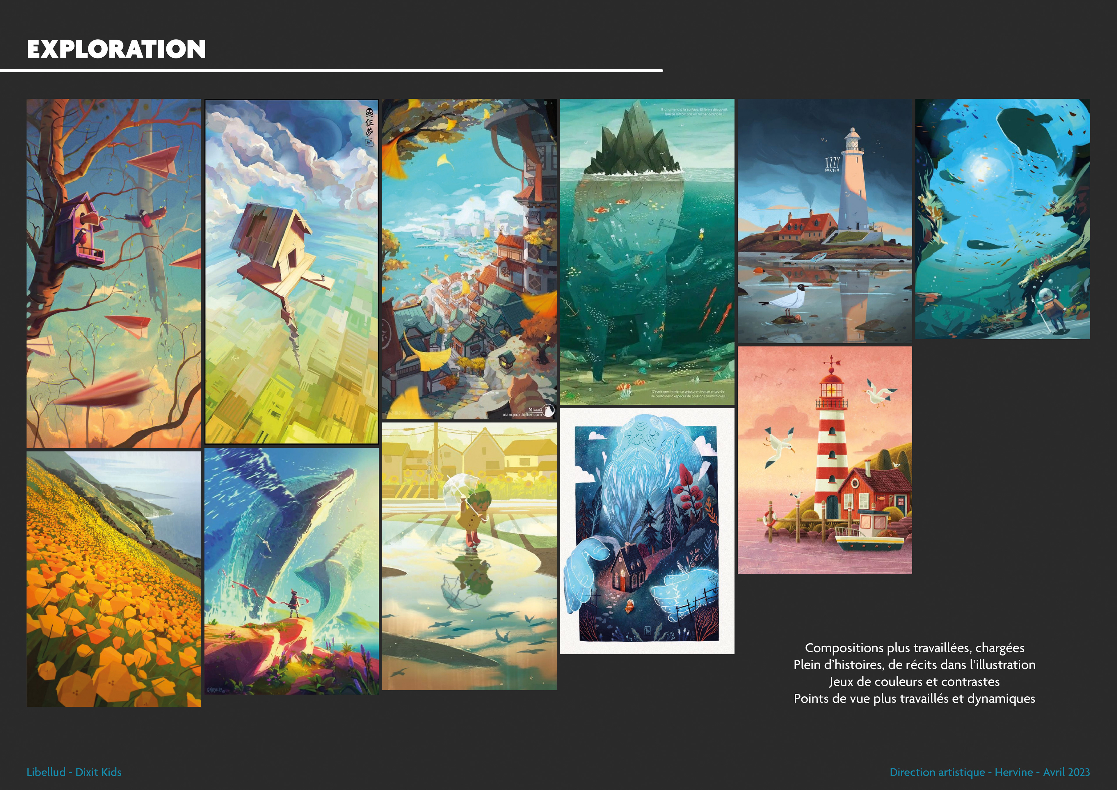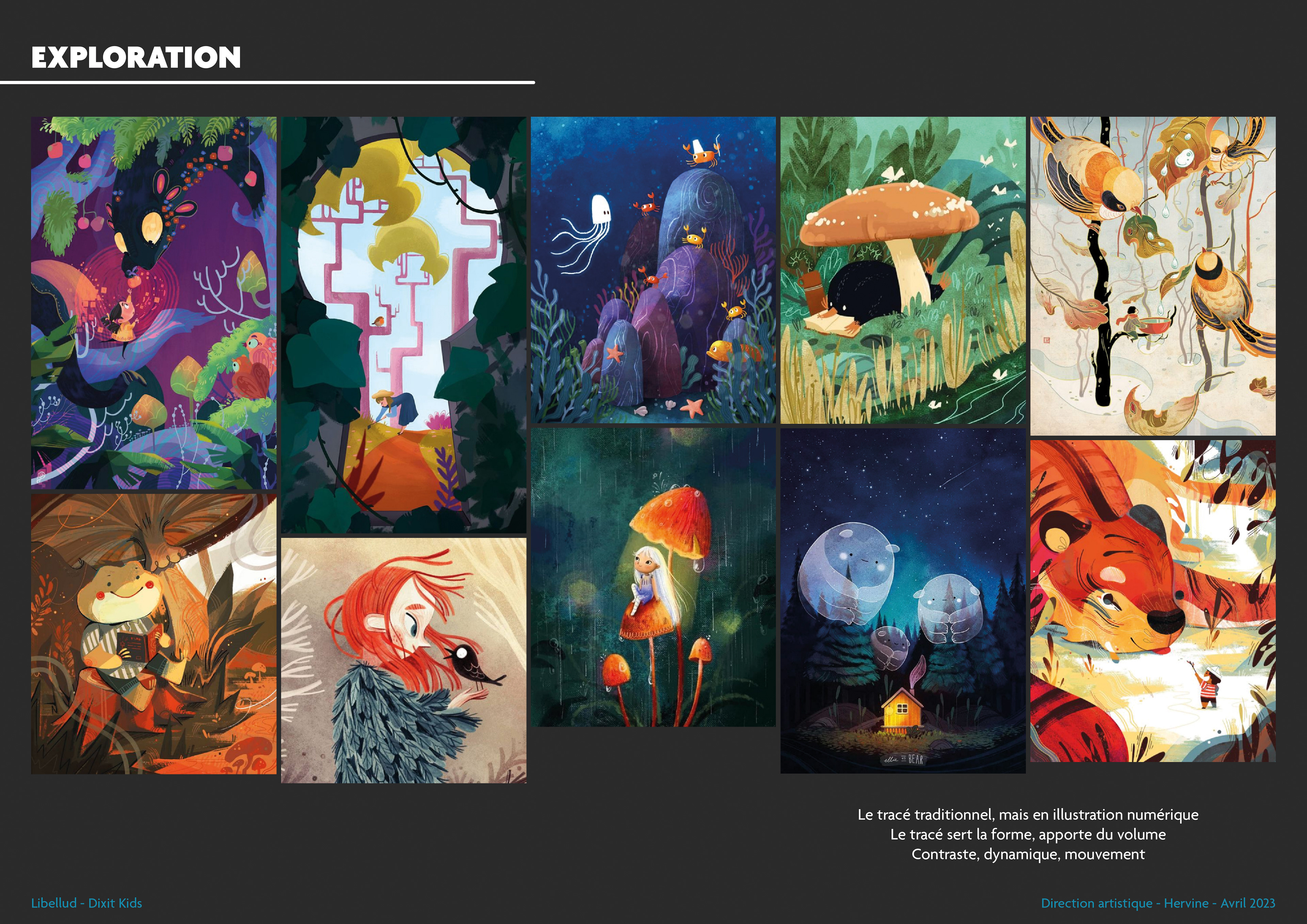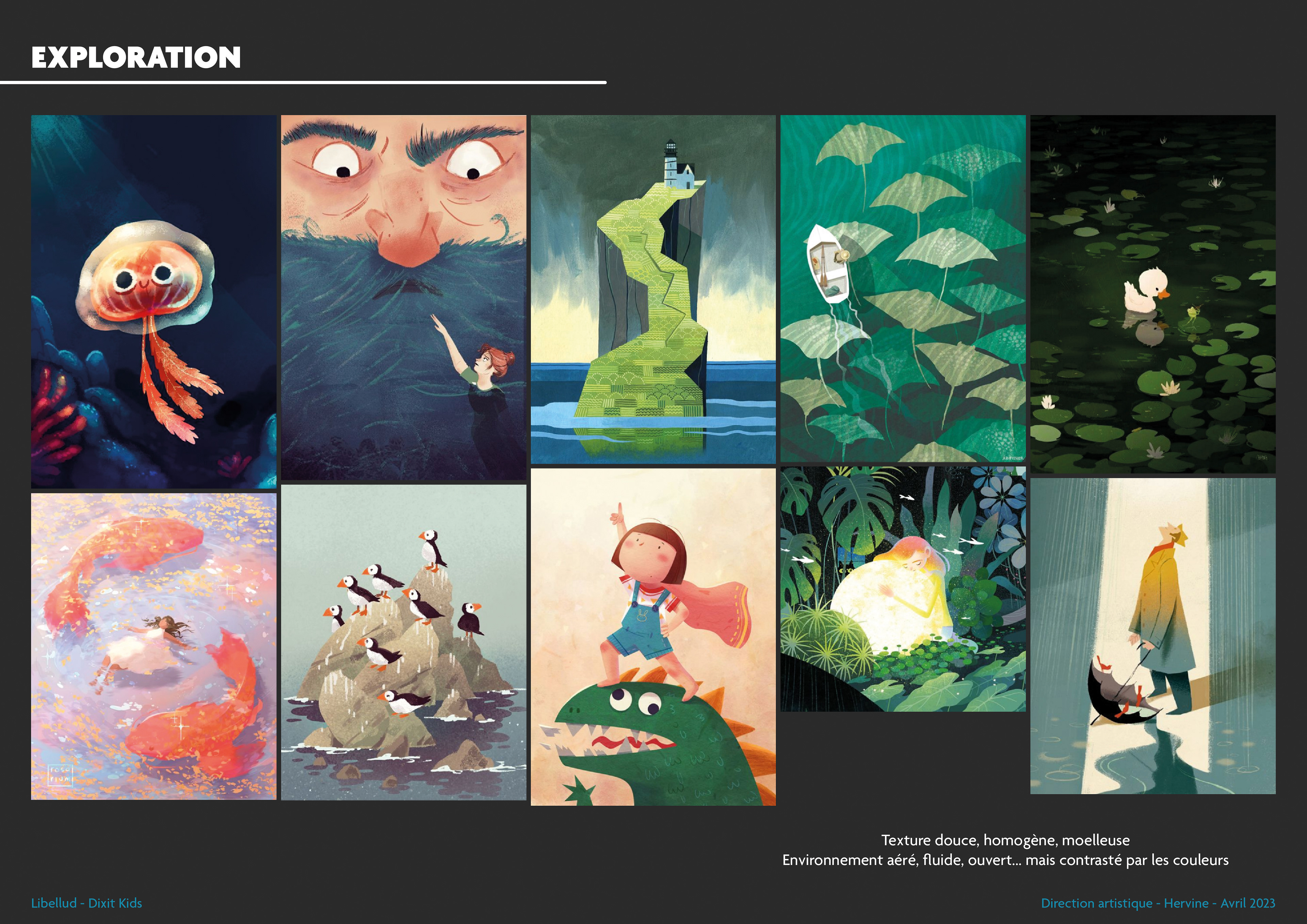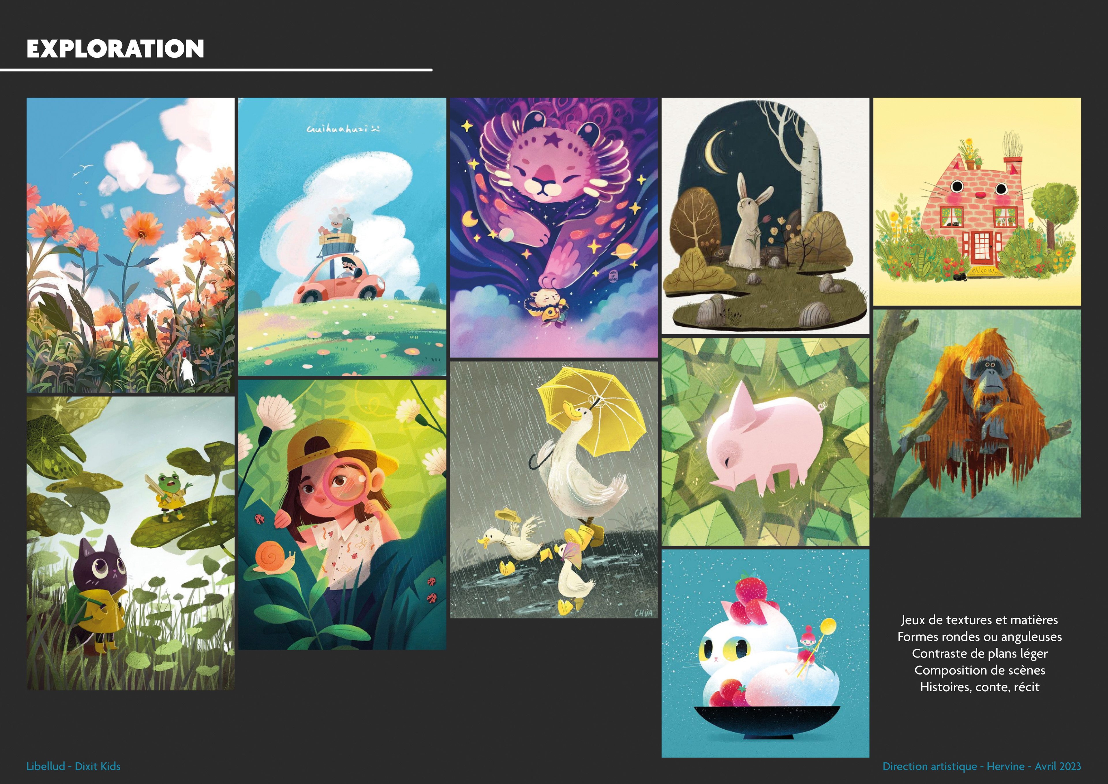 Once these explorations were complete, I proposed four graphic universes, each accompanied by four potential artists. This is a starting point for choosing the artists, but it allows us to immediately envision what the final version of Dixit Kids could look like. You'll notice that two of Dixit Kids' illustrators were already present in this pre-selection!