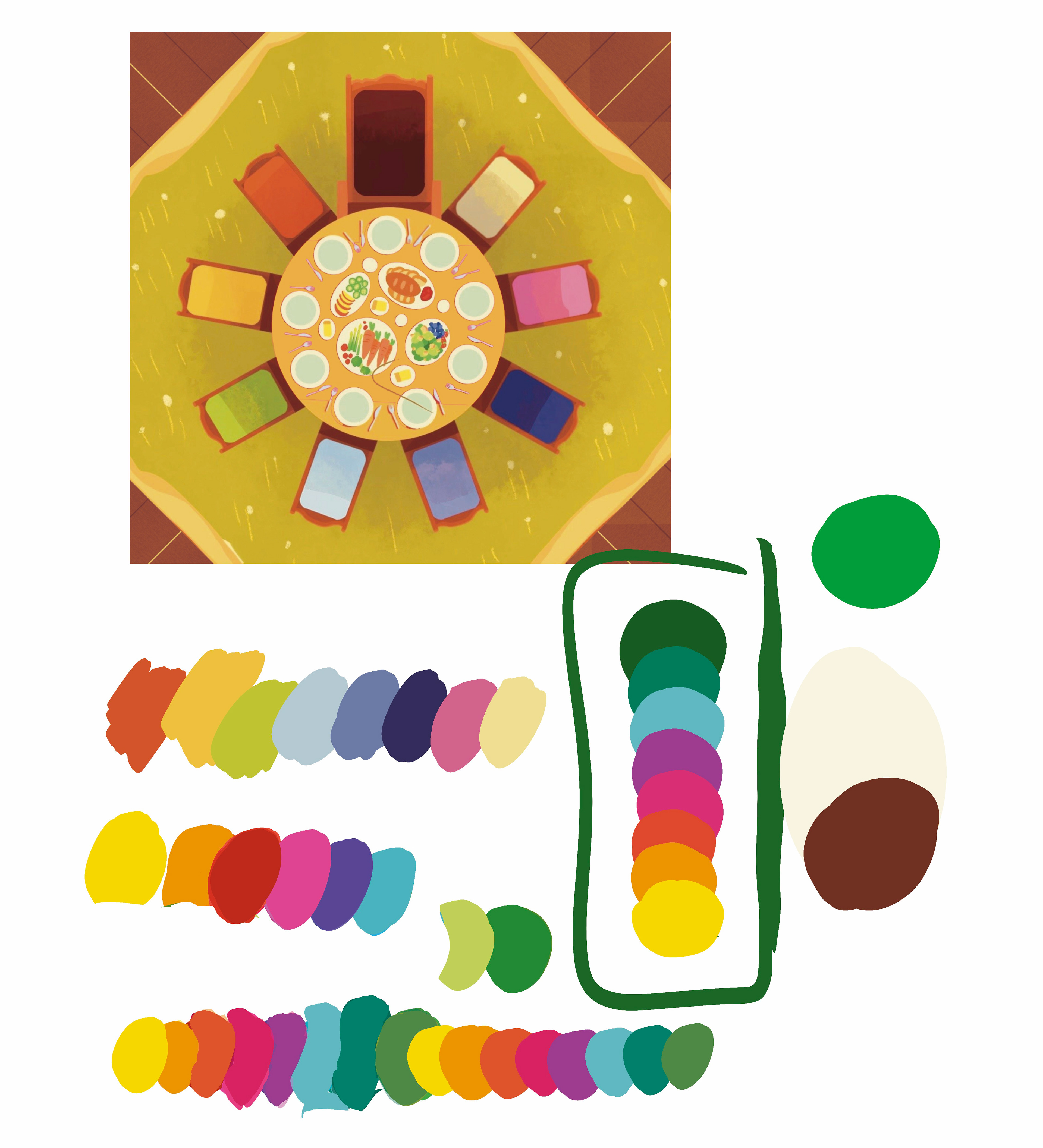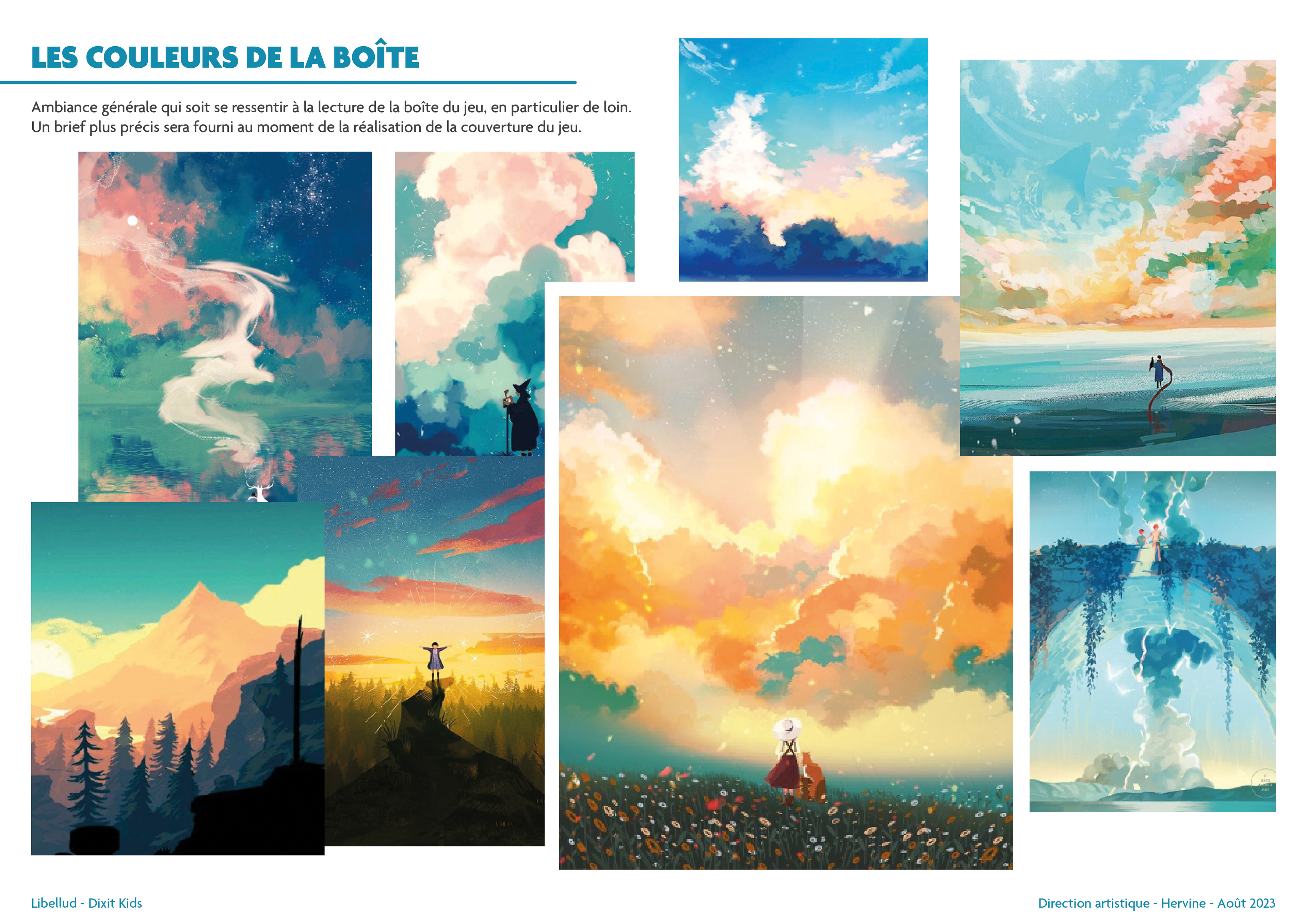 One of the strong aspects of the Dixit Universe is the presence of a celestial body in a sky. However, the sky can take on several shades and different atmospheres, which is particularly felt in the already published Dixit games. To better visualise the range of possibilities, I composed a gradient of skies and positioned the Dixit range in this spectrum. Dixit Kids' place was naturally found in green and yellow tones!
