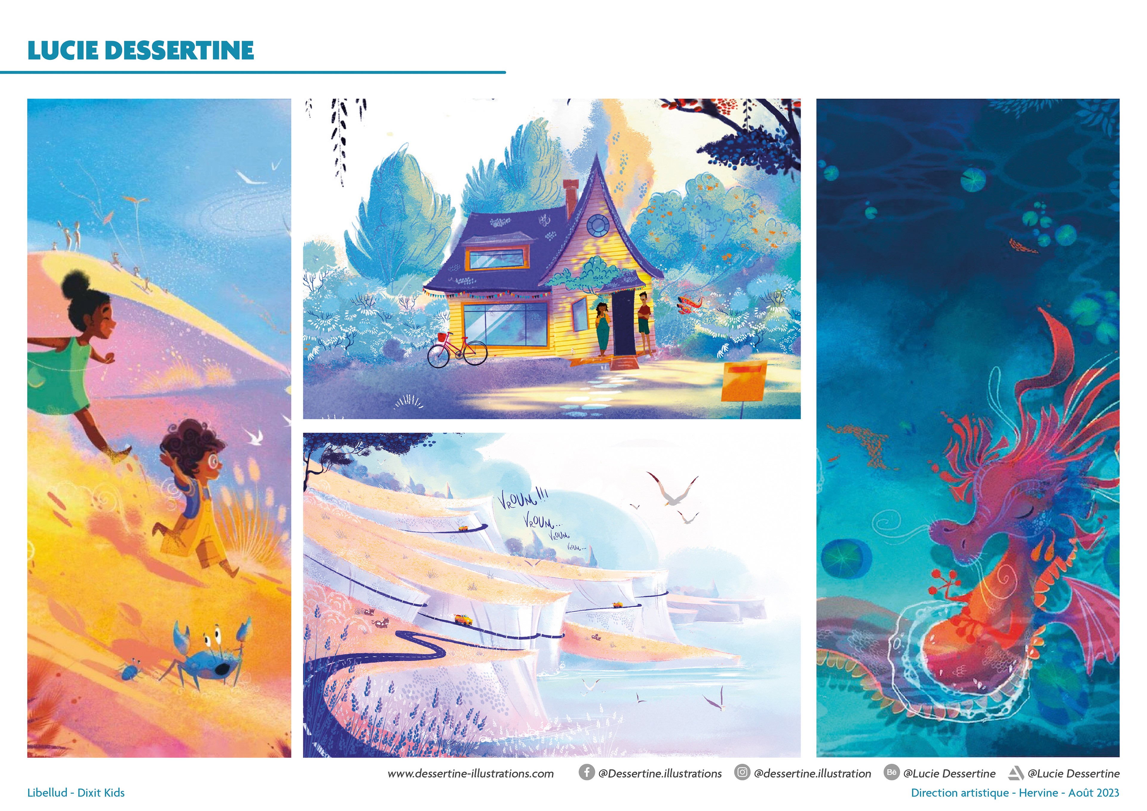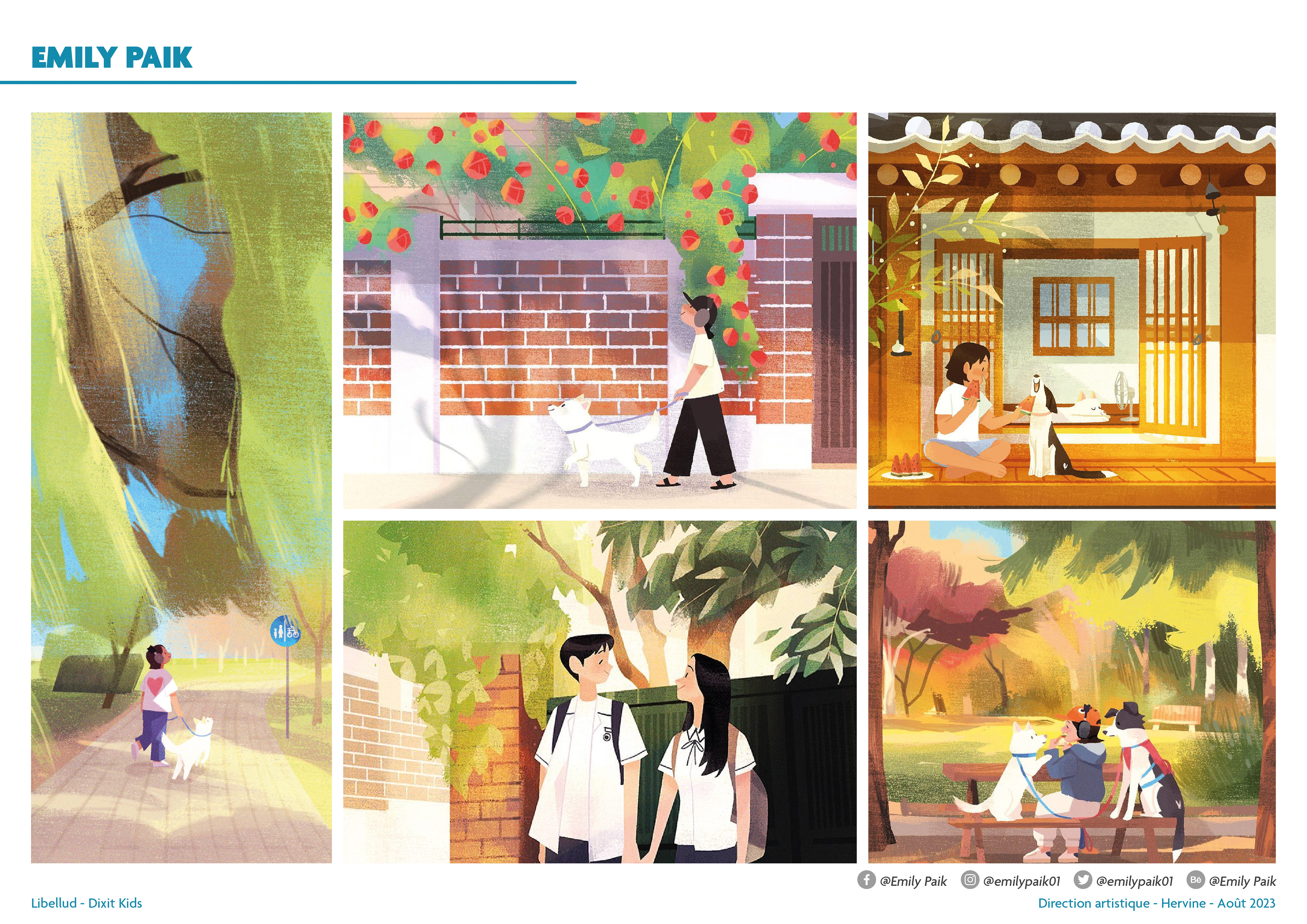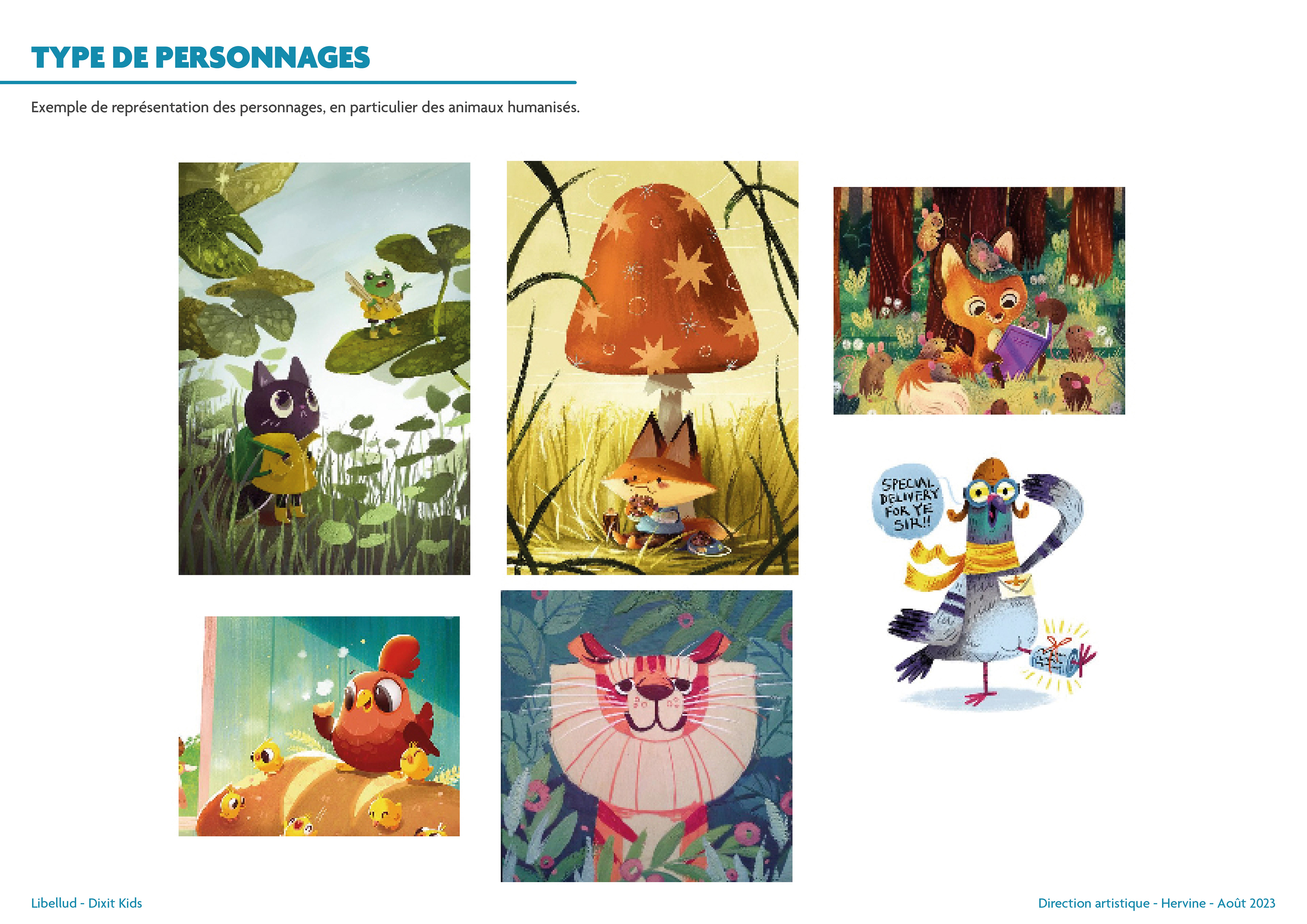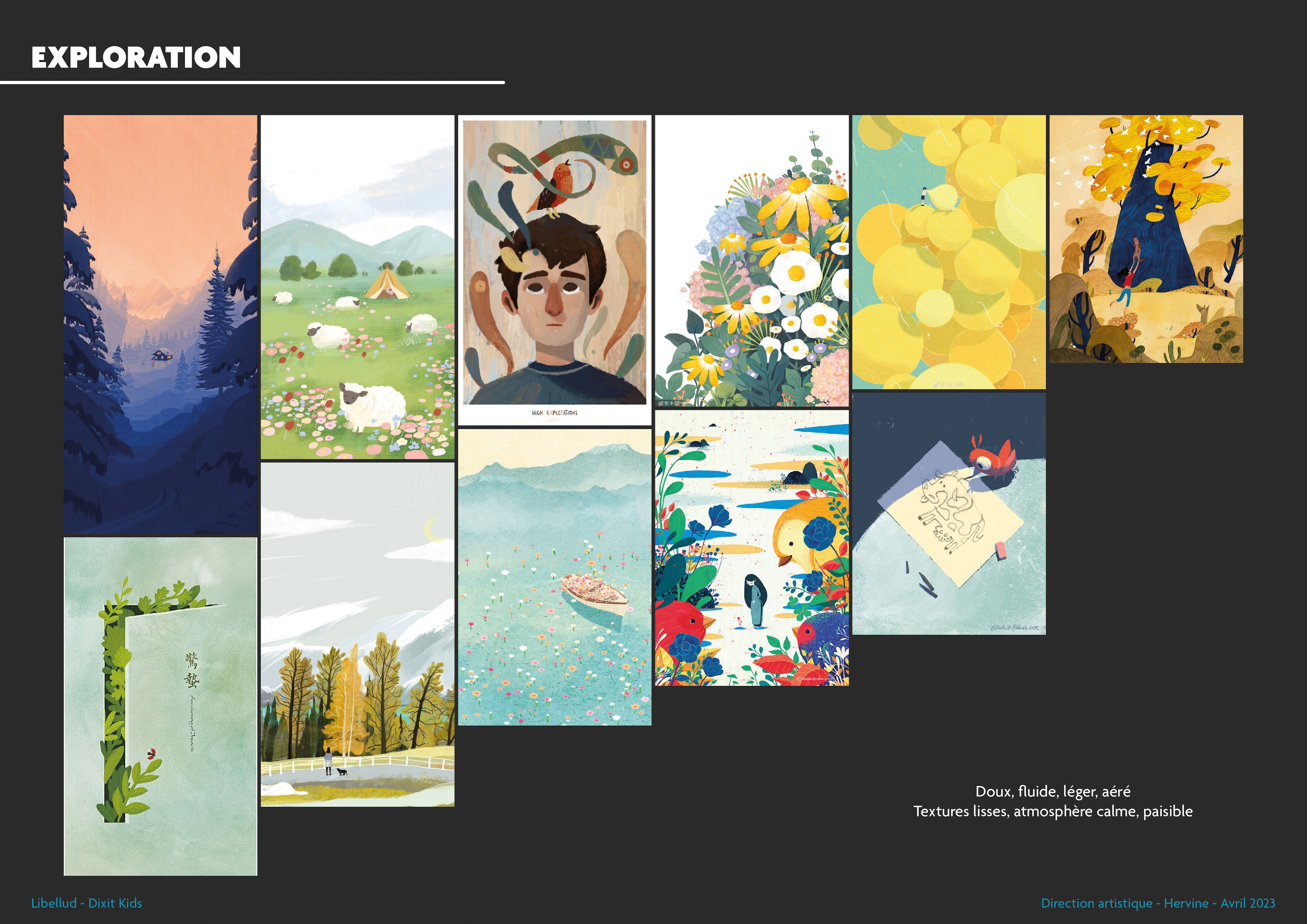 I cannot reveal certain aspects of the process, but here is an overview of the work I carried out so that the four illustrators, Seppyo (Mélanie Bardin), Lucie Dessertine, Emily (Seung Eun) Paik and Lemonjuiceday (Iris Winker), could work in the best possible conditions. The illustrations in the moodboards presented opposite include illustrations that do not belong to Dixit or the publishing houses.