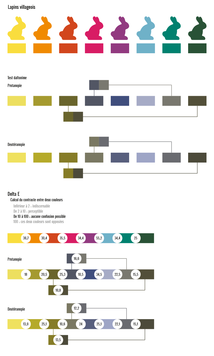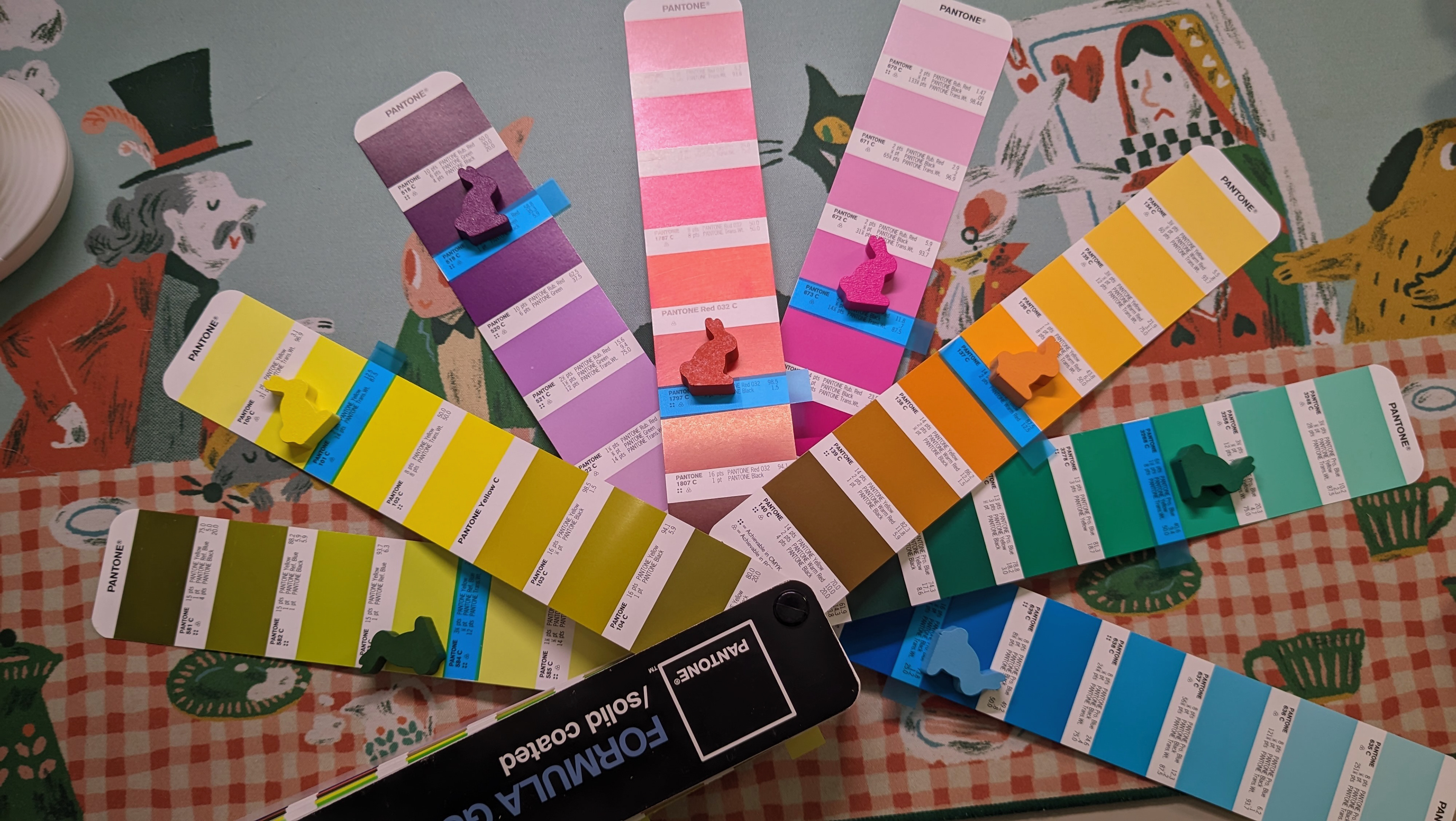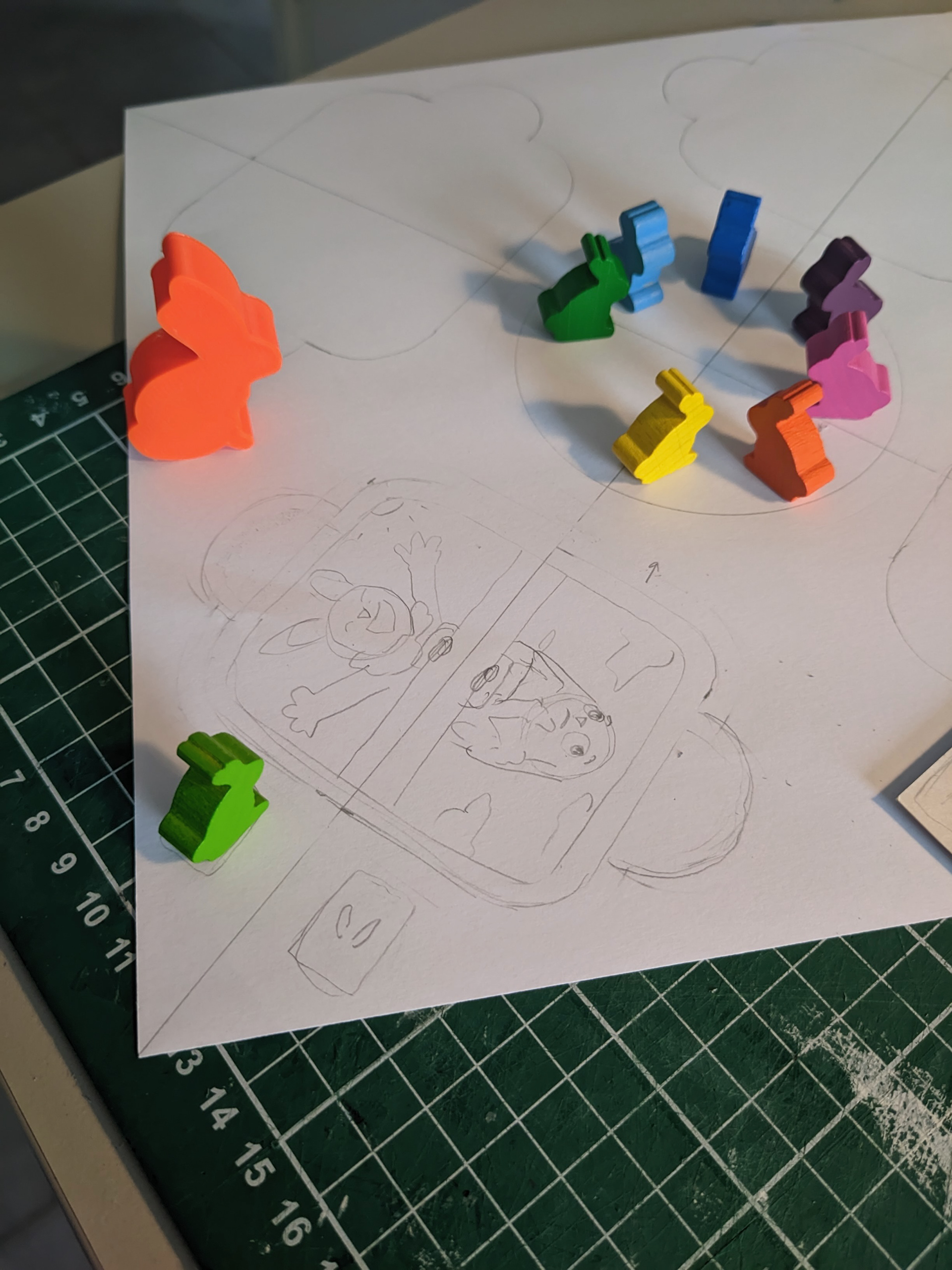 The rabbits have the same silhouette as the rest of the Dixit range. However, I carefully chose their colours. New shades for a new game, which blend perfectly with the colourful world of Dixit Kids, whilst offering strong enough contrasts so that as many people with colour blindness as possible can differentiate the meeples from each other. This isn't an essential aspect of the game mechanics, but for children, simply being able to clearly identify the rabbits can make the game experience smoother.