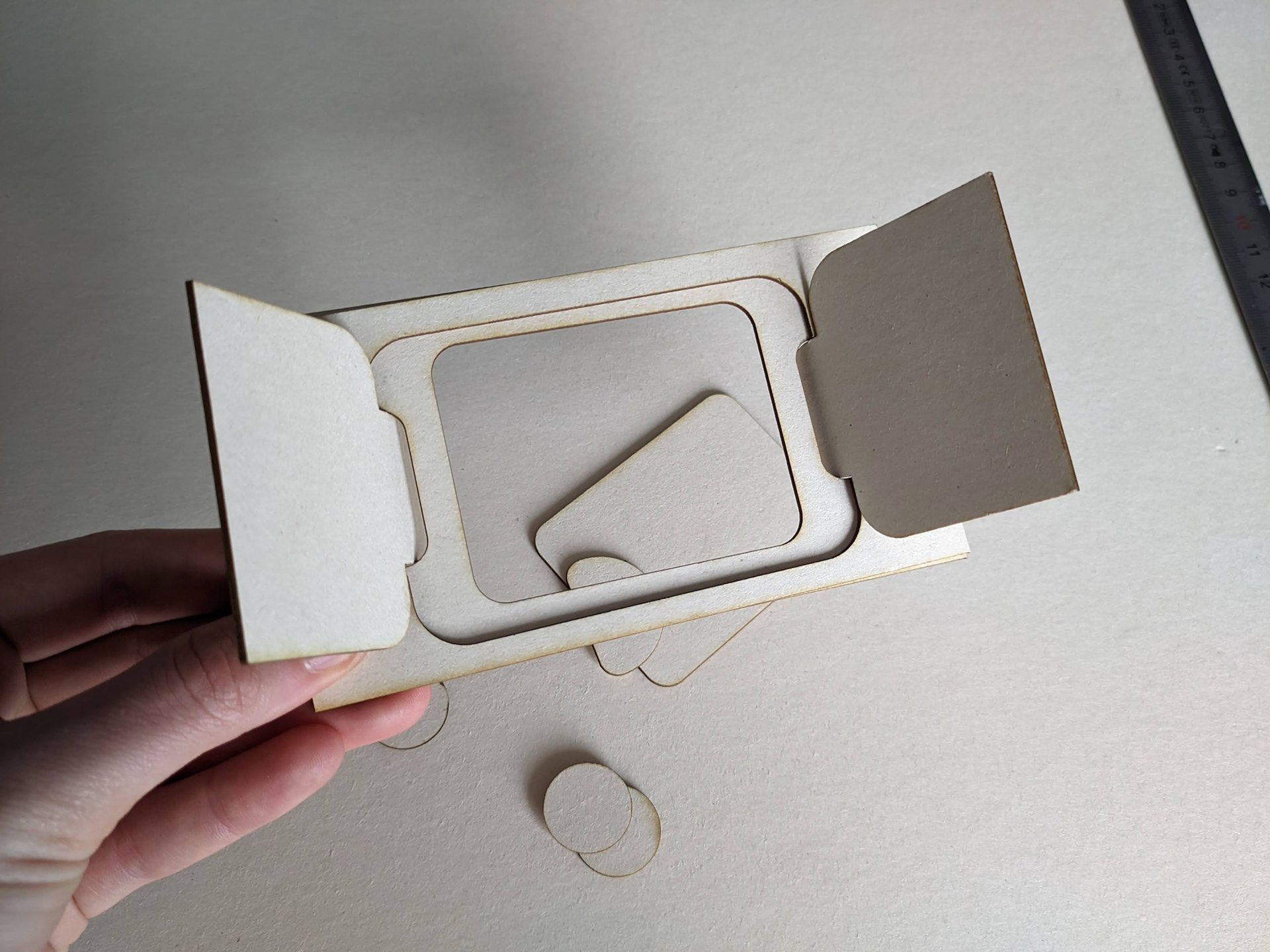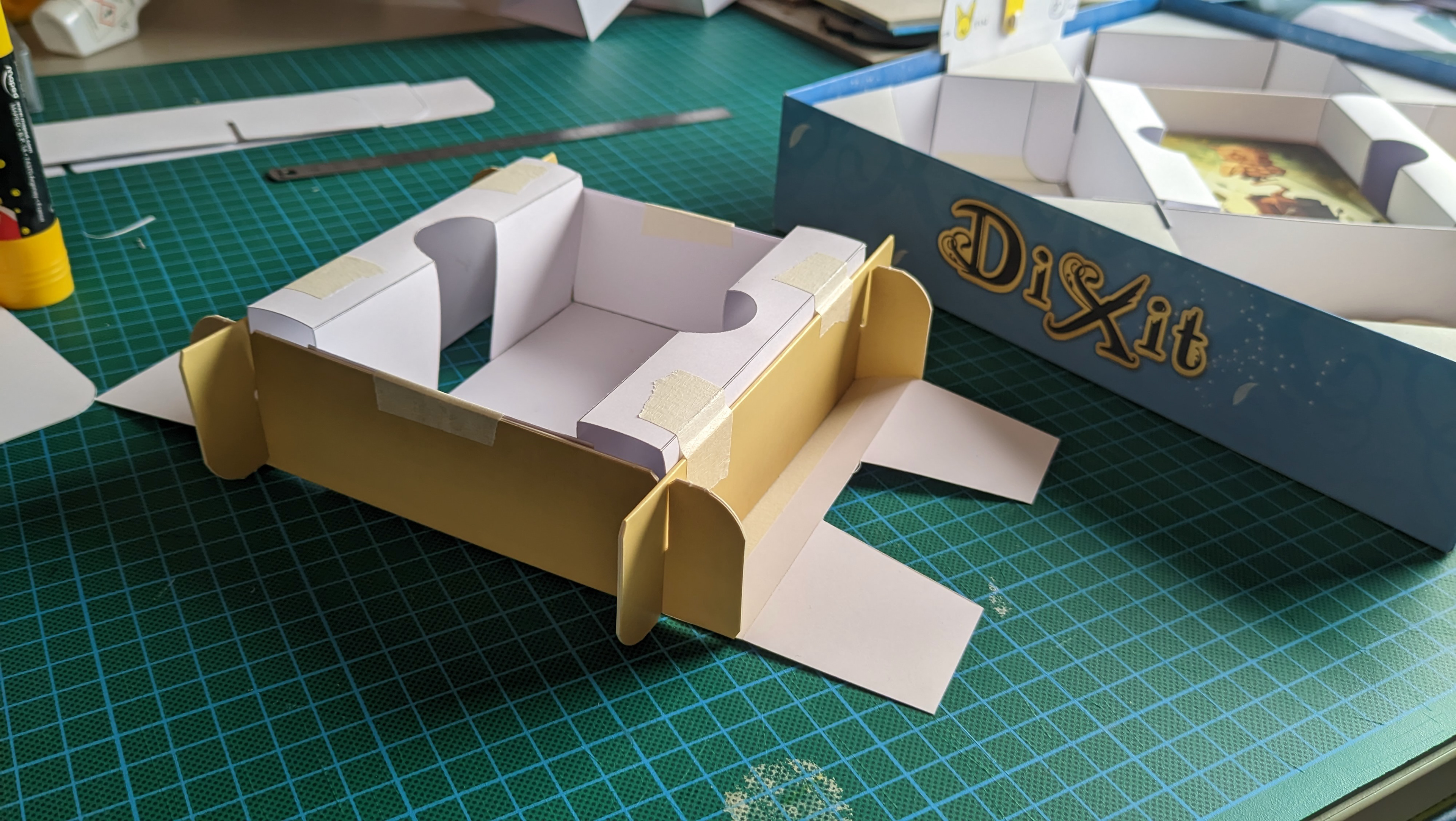 The game board must be properly secured in the box, because if you lean on a corner and the entire game board tilts... you have to start a new game! With children, this kind of accident happens quickly. And with all that, where to store the cards? The burrows are too small to accommodate them. It's also the heaviest element of the game: how to ensure it doesn't destroy the insert during transport? My first versions of the insert were far too complex, but they allowed me to test and find solutions to all these issues.