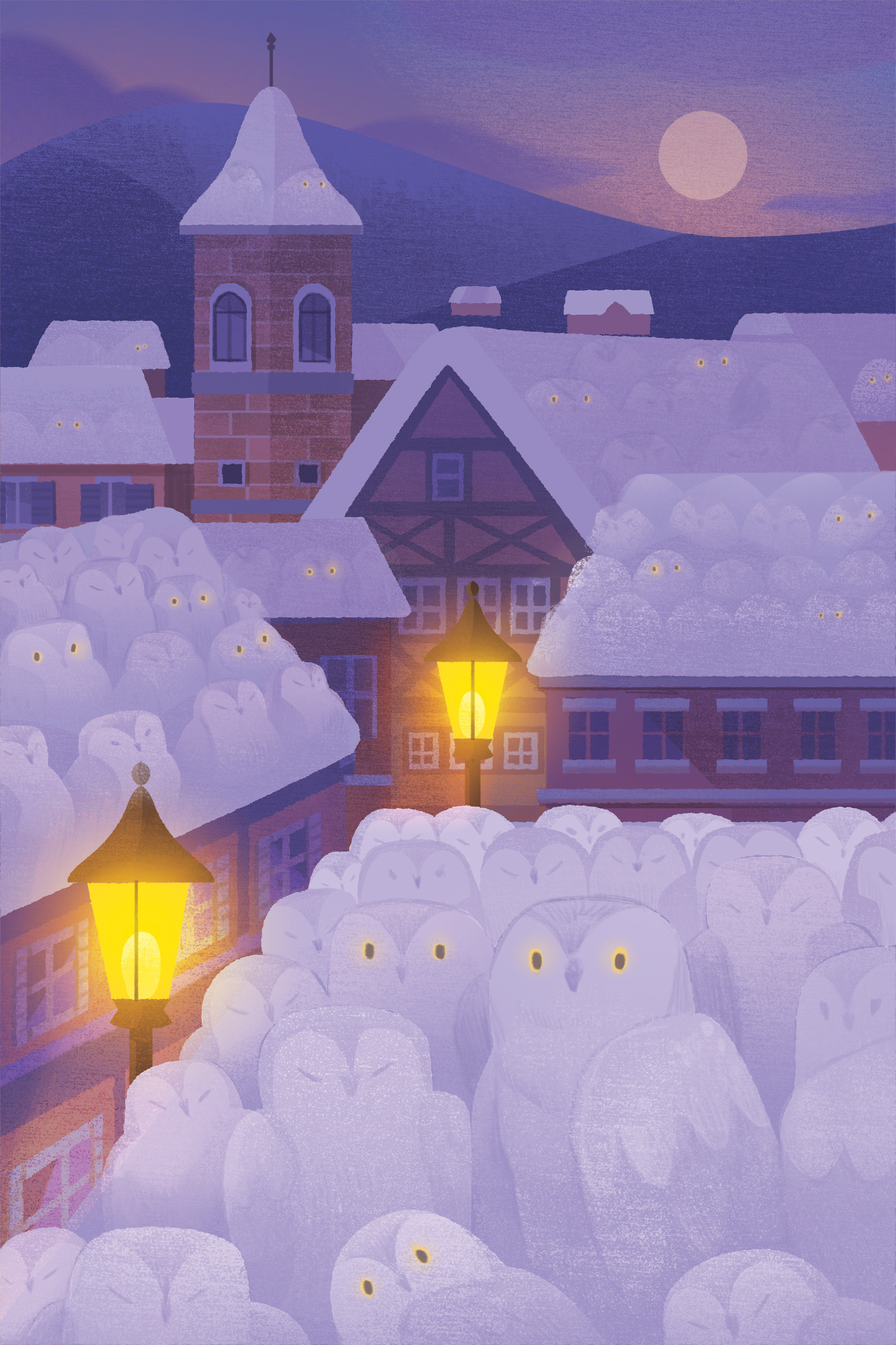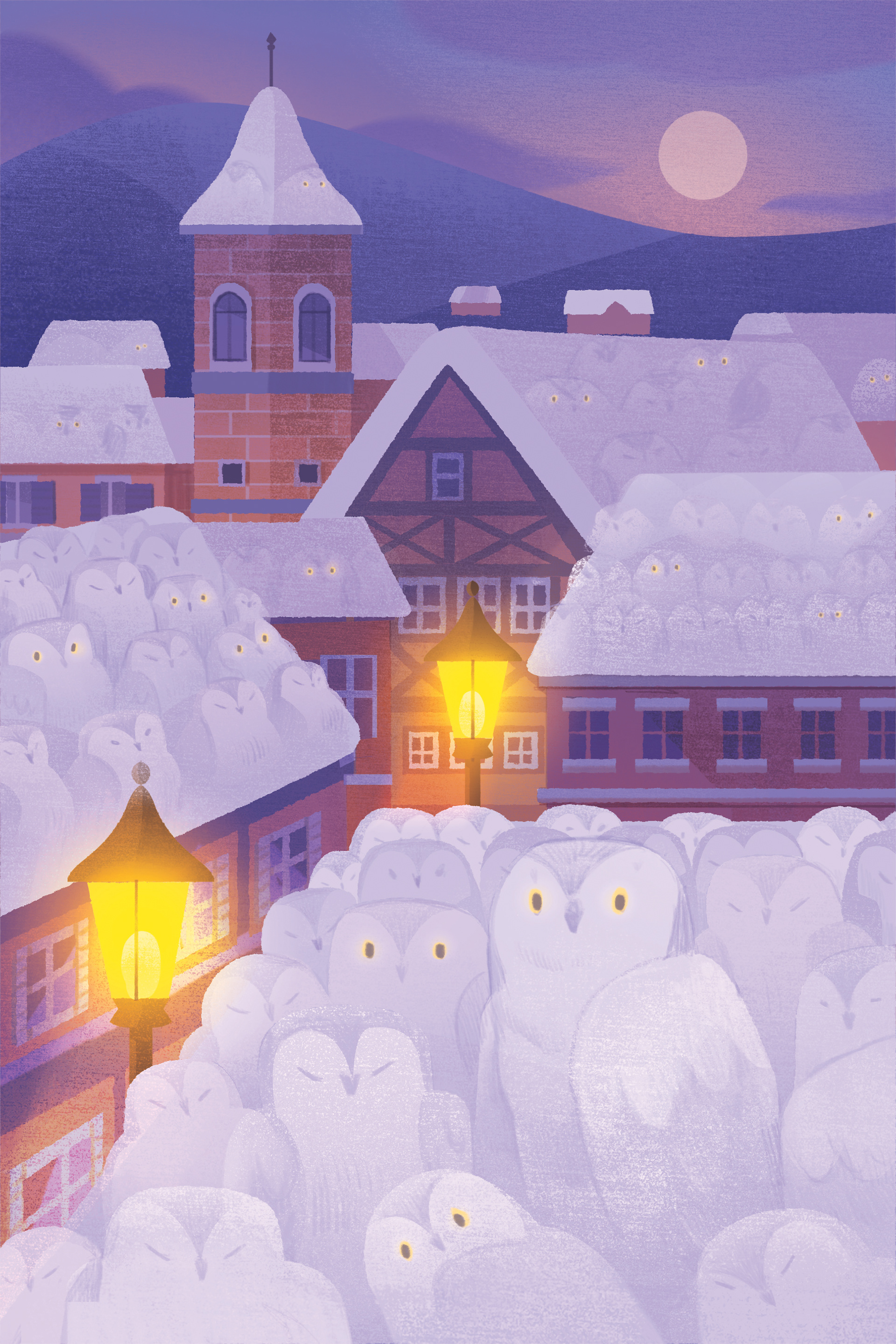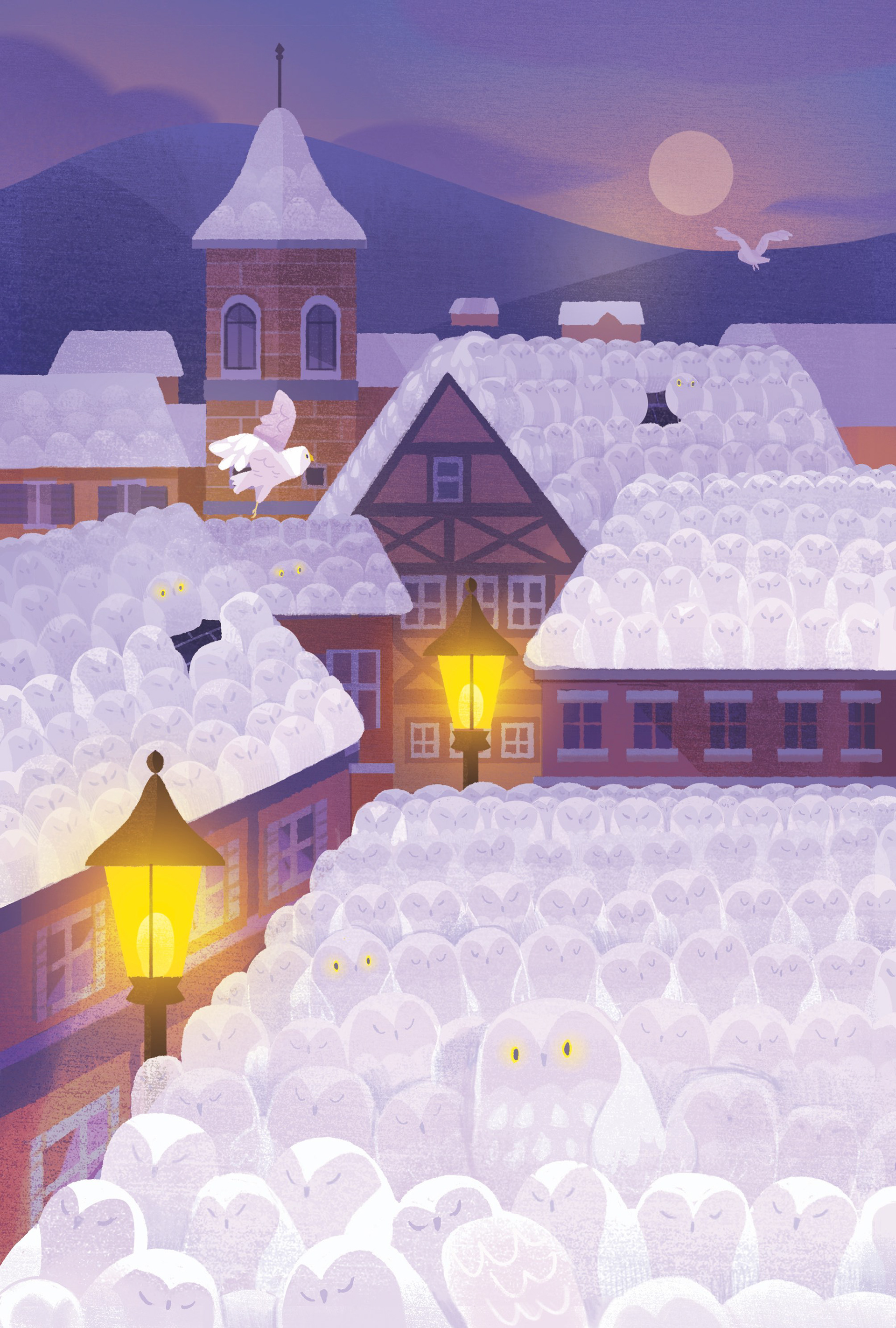 Here, for example, are the different stages of creating a card illustrated by Emily Paik: the entire subtlety of this card is to create both the sensation of snow and of owls! This is one of the first cards Emily illustrated, it allowed us both to learn how to communicate effectively, especially with two completely different cultures... because Emily is Korean!