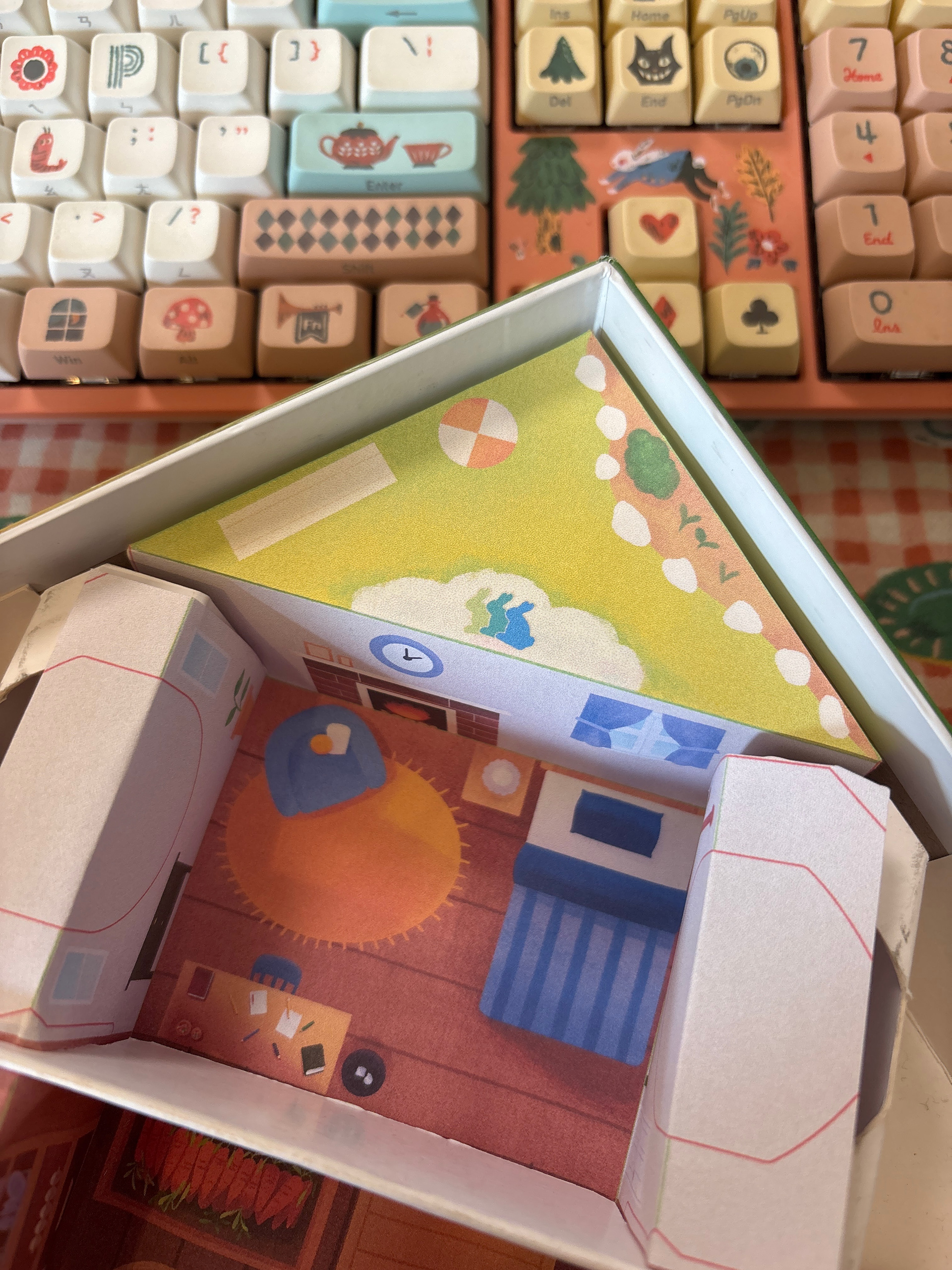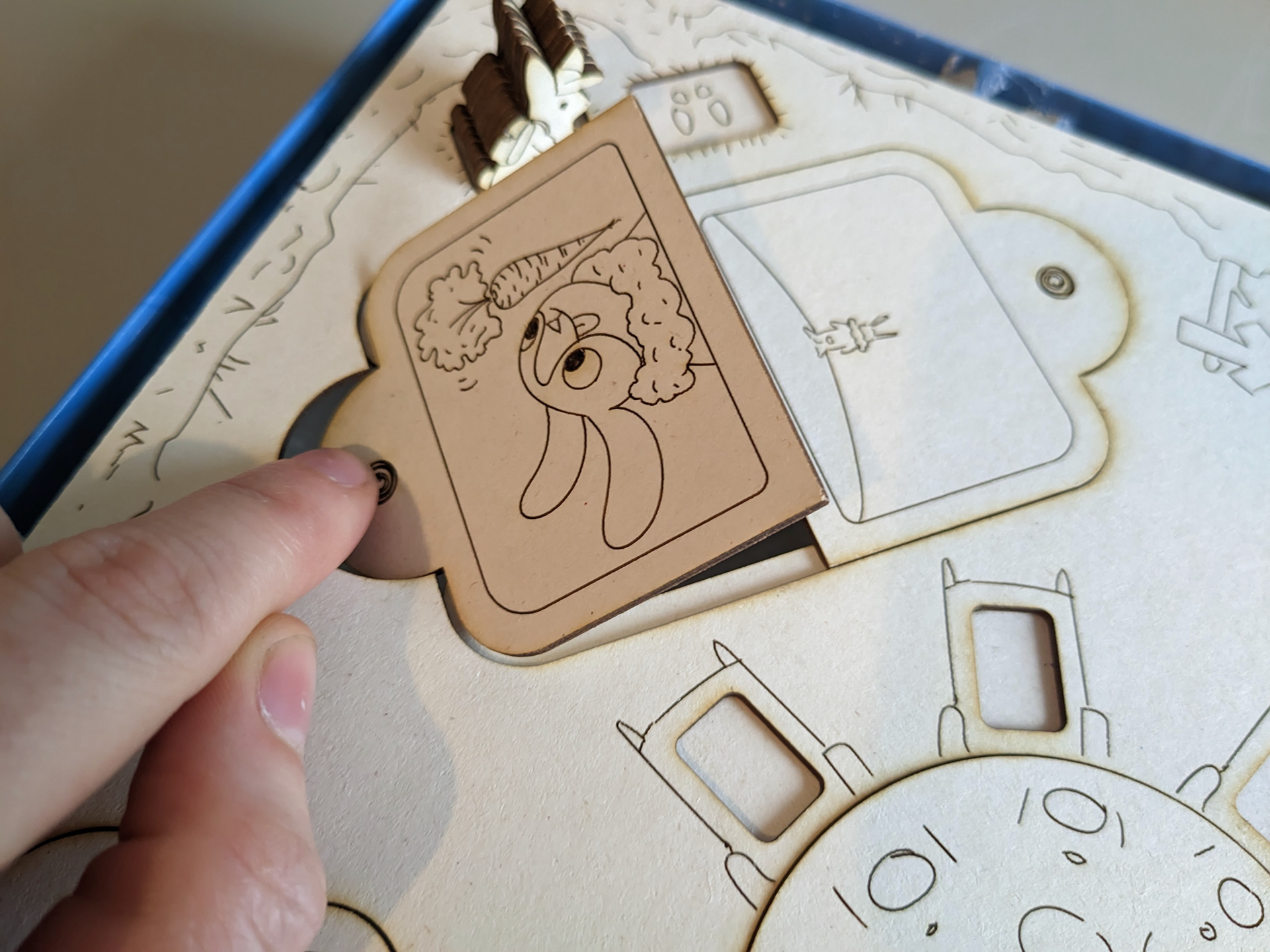 When I was entrusted with the project, we were already playing in the box with the game board placed on top, with wedges glued inside. The key you see in the centre of the game board was used to lift the doors via the padlock hole. You had to discard a certain number of tokens to successfully free the emotion rabbit.