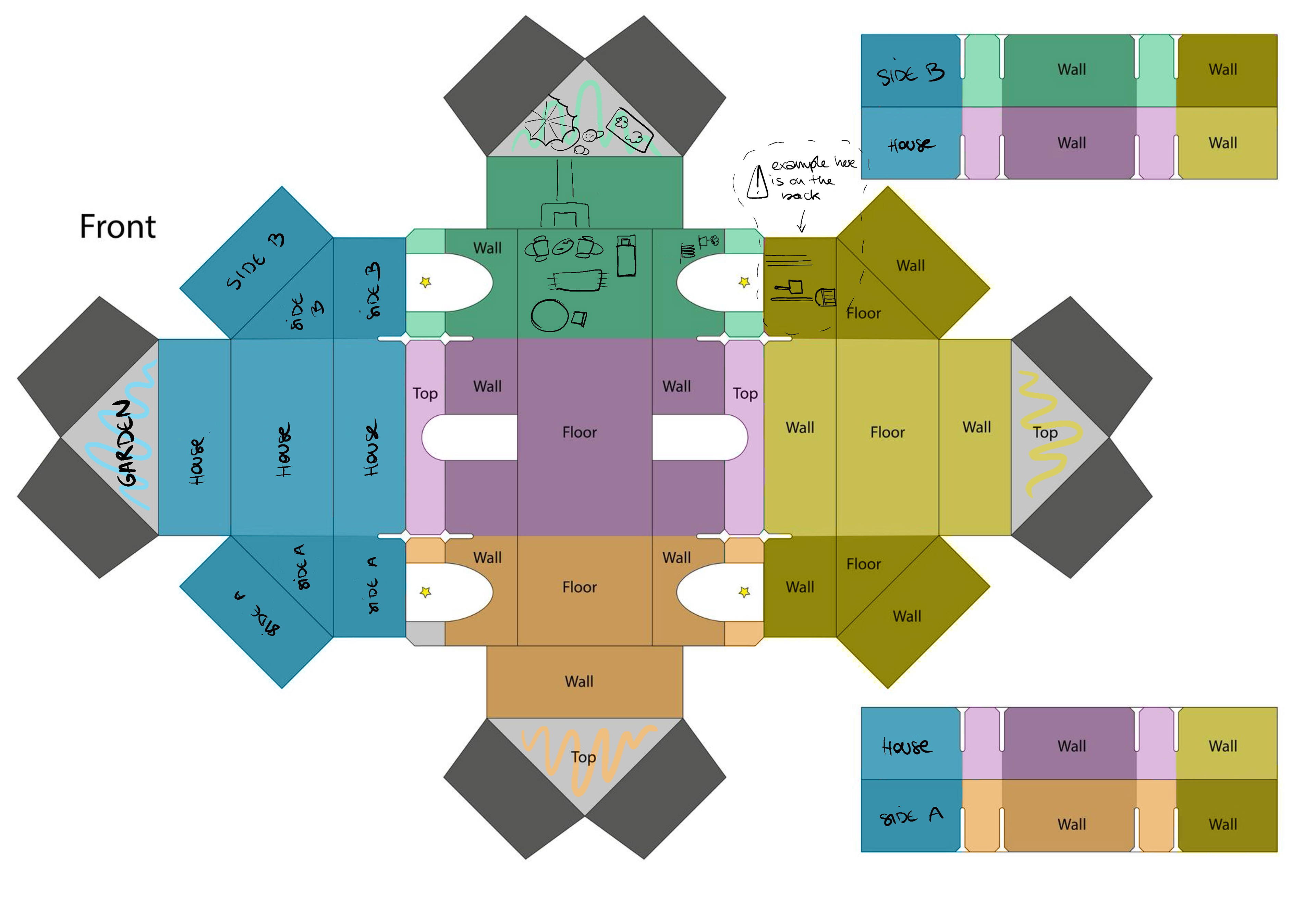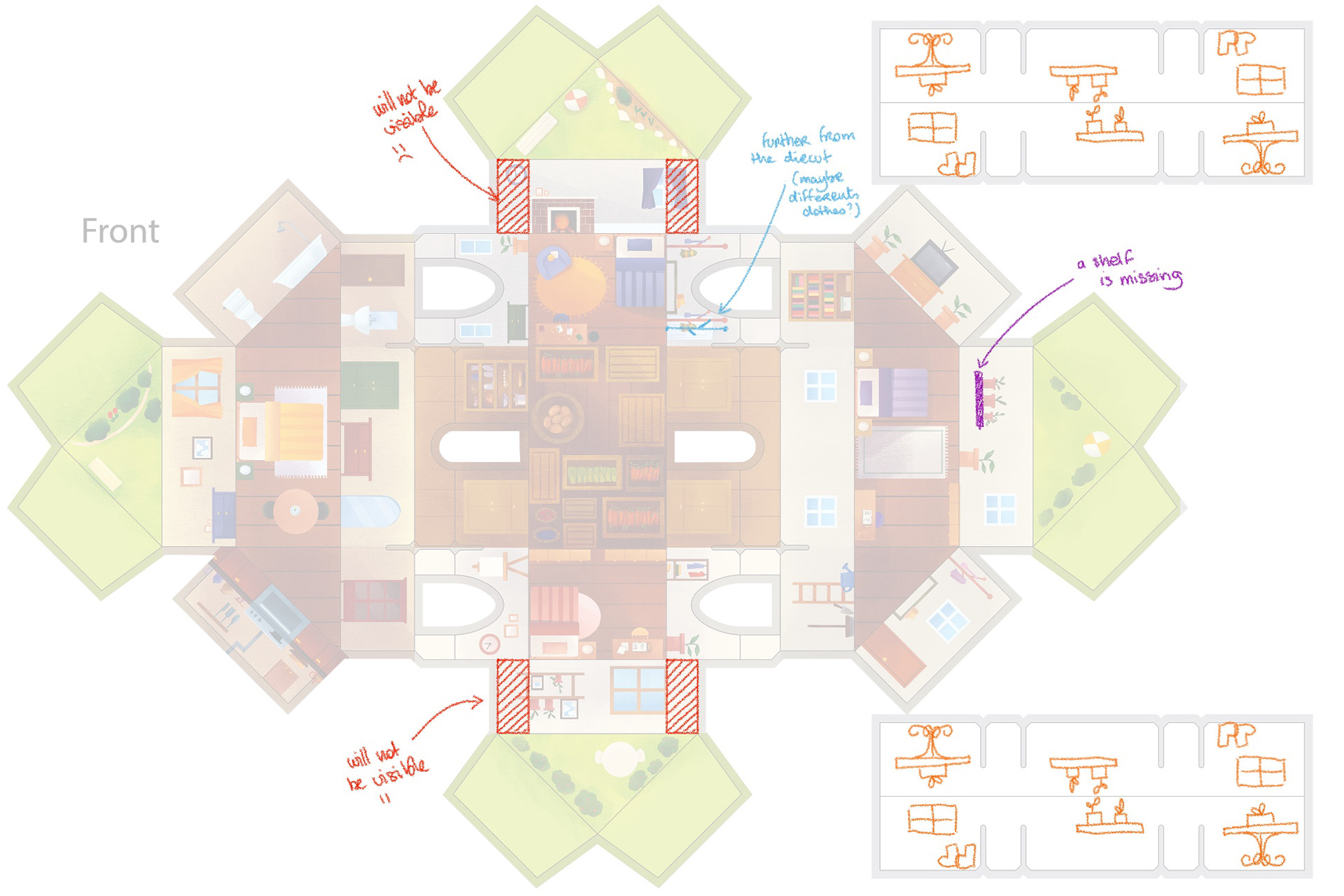 After the research and development, I had to provide instructions to the illustrator Emily Paik so she could decorate this complex template. For someone who has never illustrated a 3D object like a board game, understanding the geometry of this template can be a real challenge! We exchanged several times to ensure everything was clear, and the small adjustments were very quickly resolved.