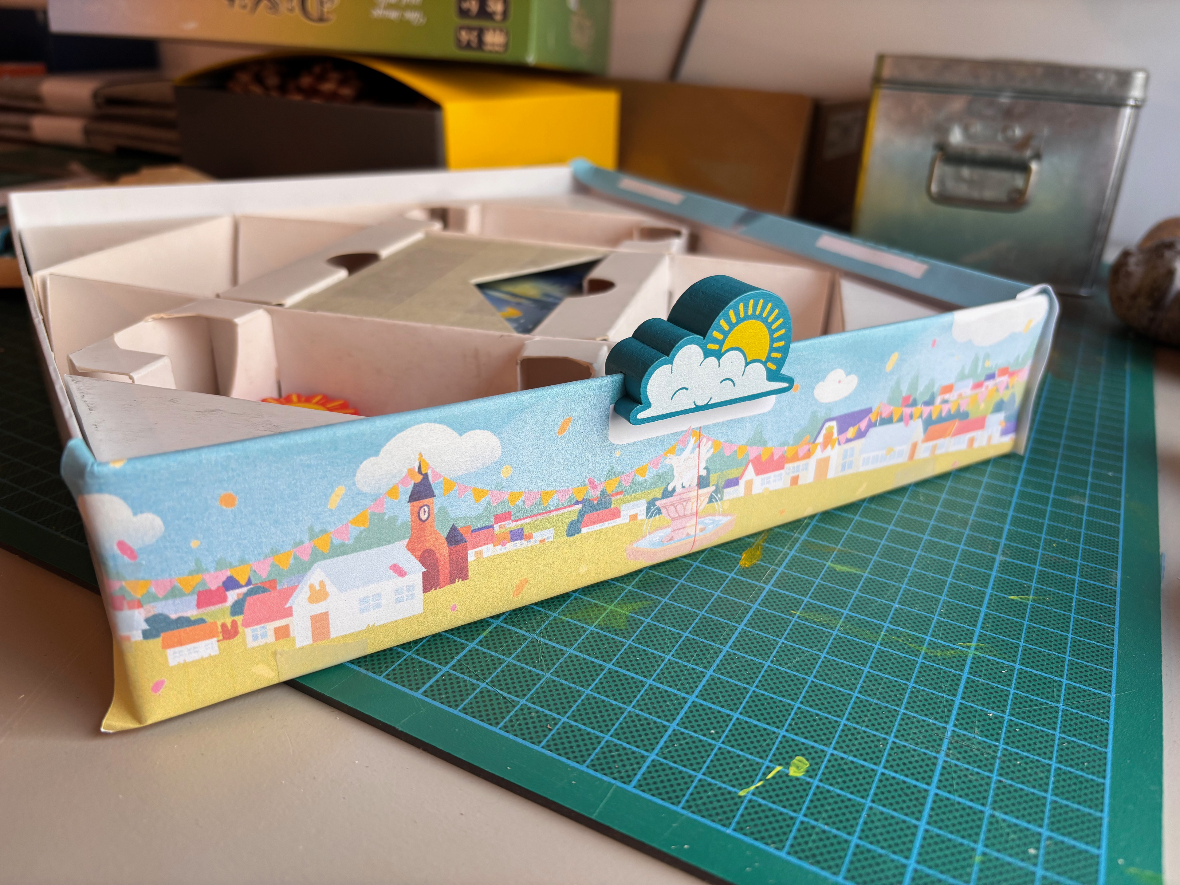 We play directly in the box, it's the central element on the table... but its edges weren't being used at all! It was a small technical challenge to create a slot in the meeple that would be the right width to stand upright without being too tight. A little train, then a tractor, and finally this Sun came to life in this final version!