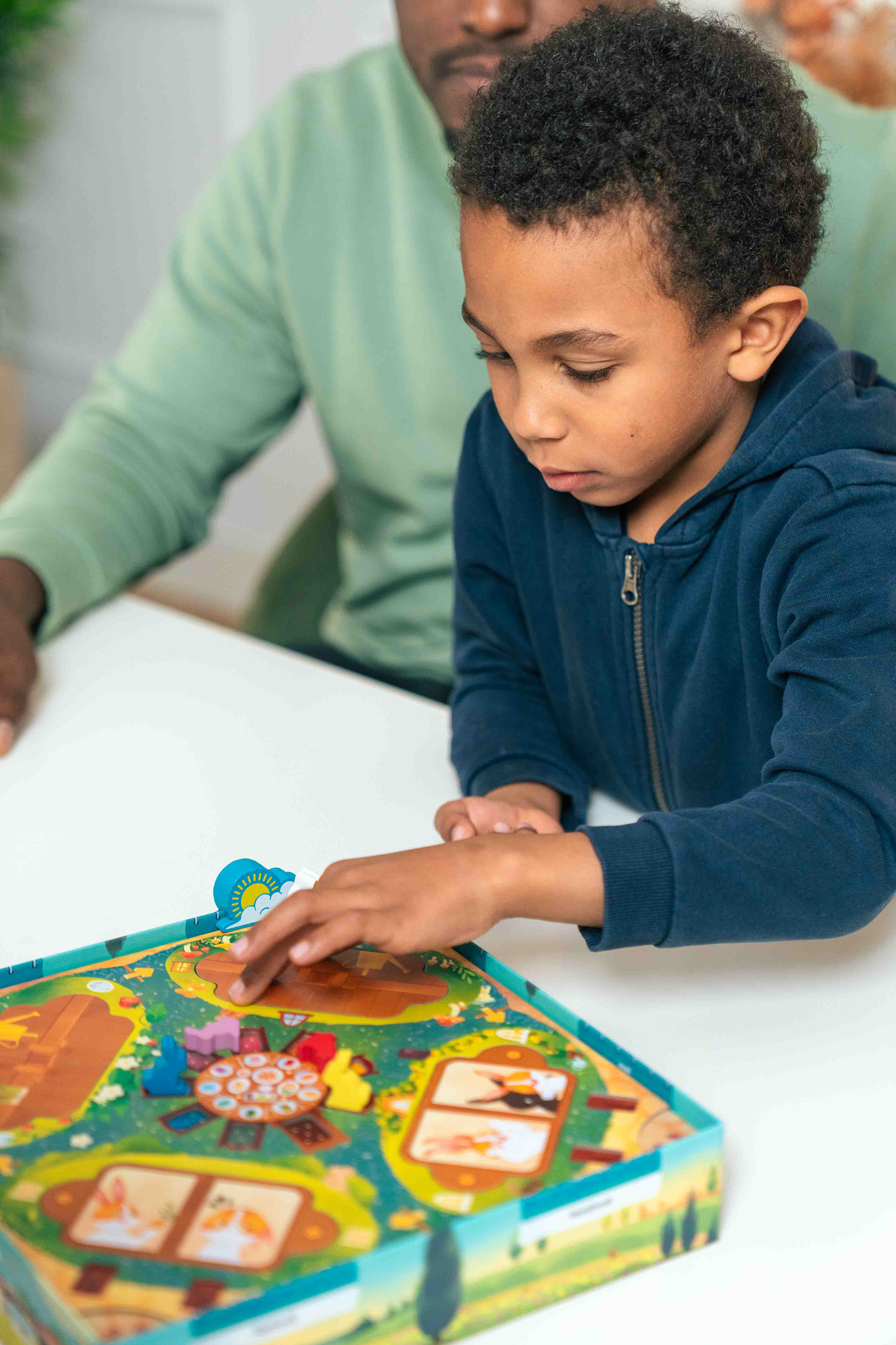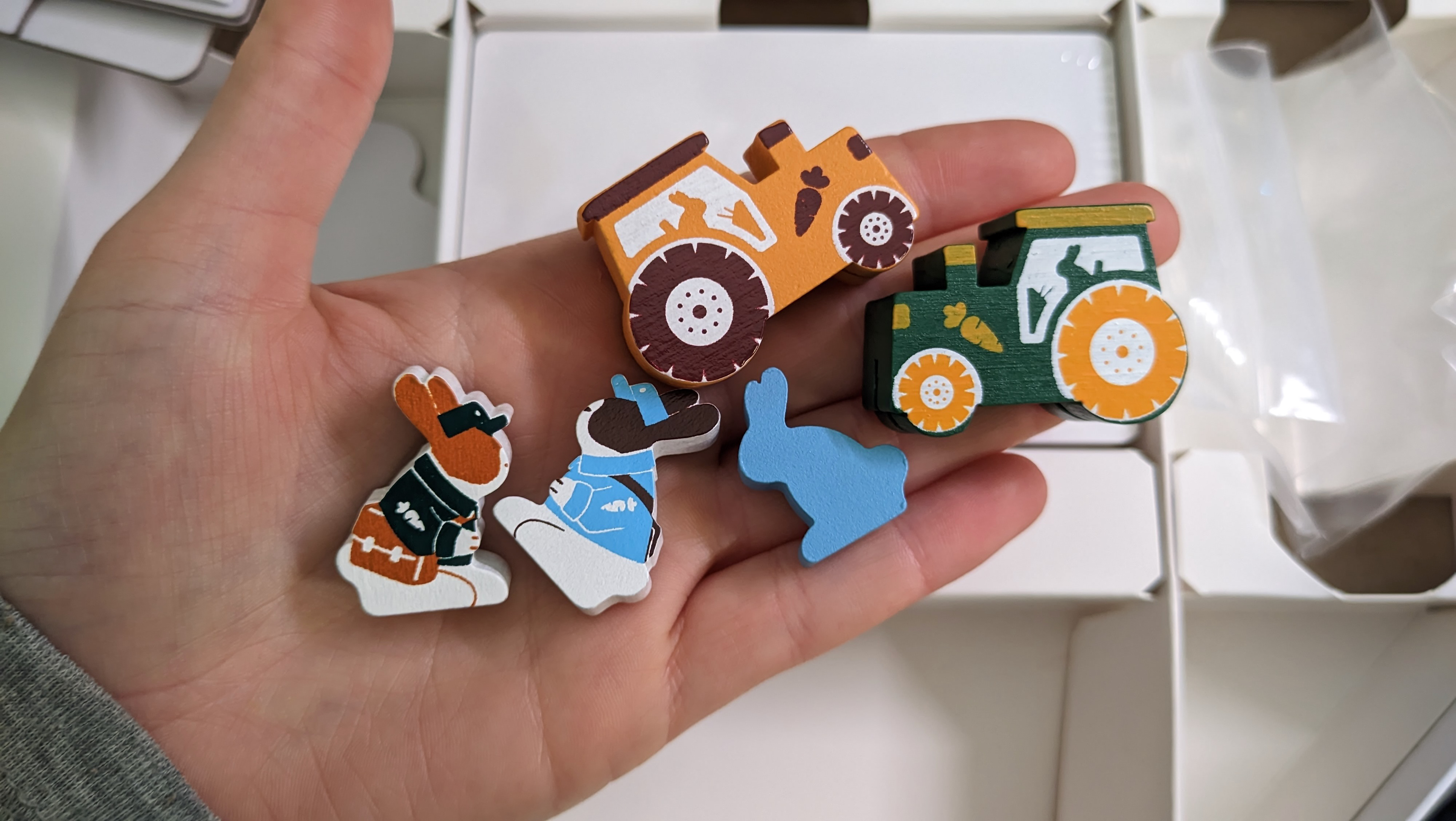 To know who is the Head Mailrabbit during the turn, there was supposed to be a first player pawn. Its appearance changed several times, but we very often forgot it: it wasn't intuitive to pass it to the next player, and we got lost. Moreover, children have smaller hands than us, so it's difficult for them to hold such a large deck of cards and distribute them.