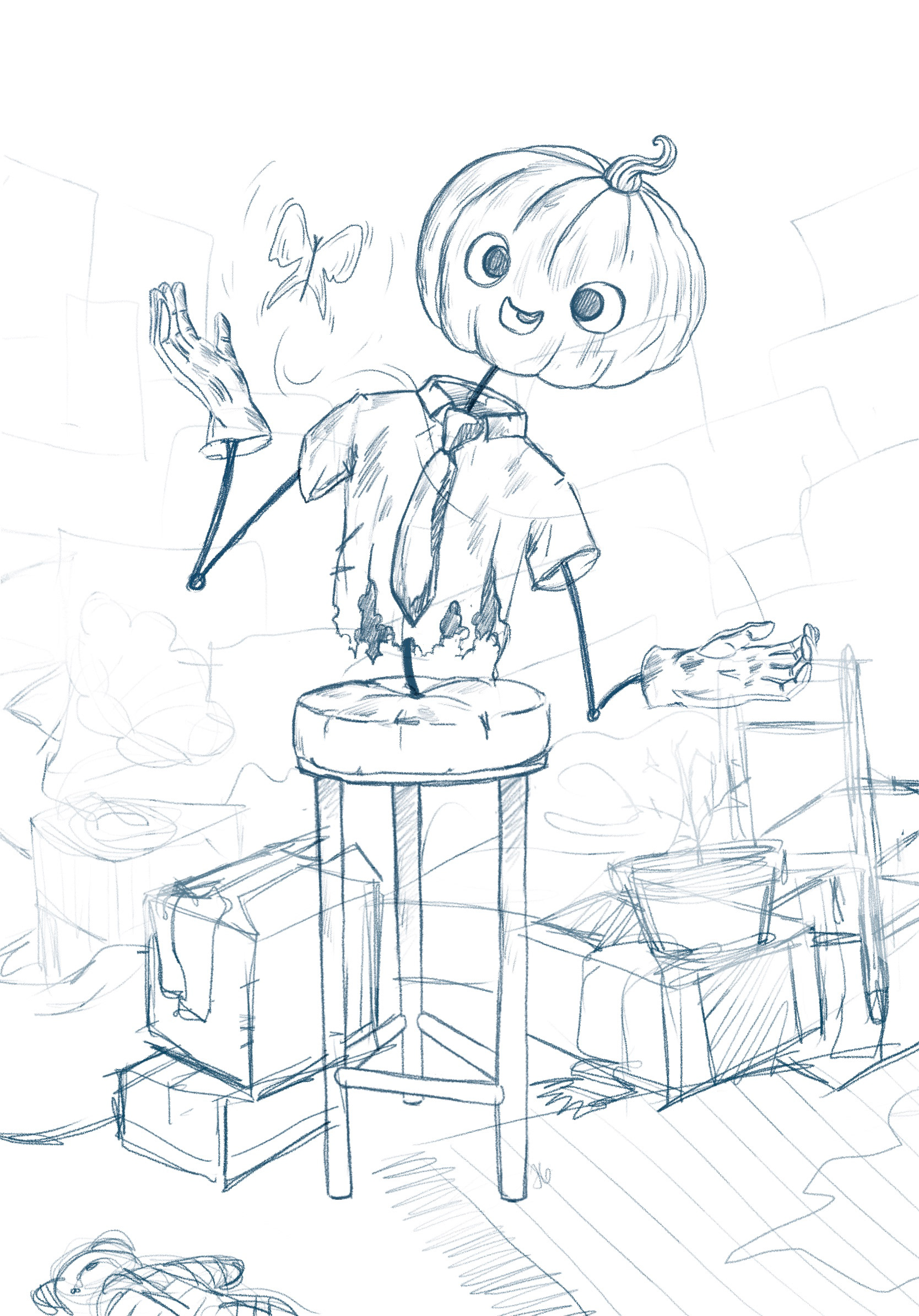 In the dark recesses of the attic, the pumpkin-headed scarecrow waits patiently.