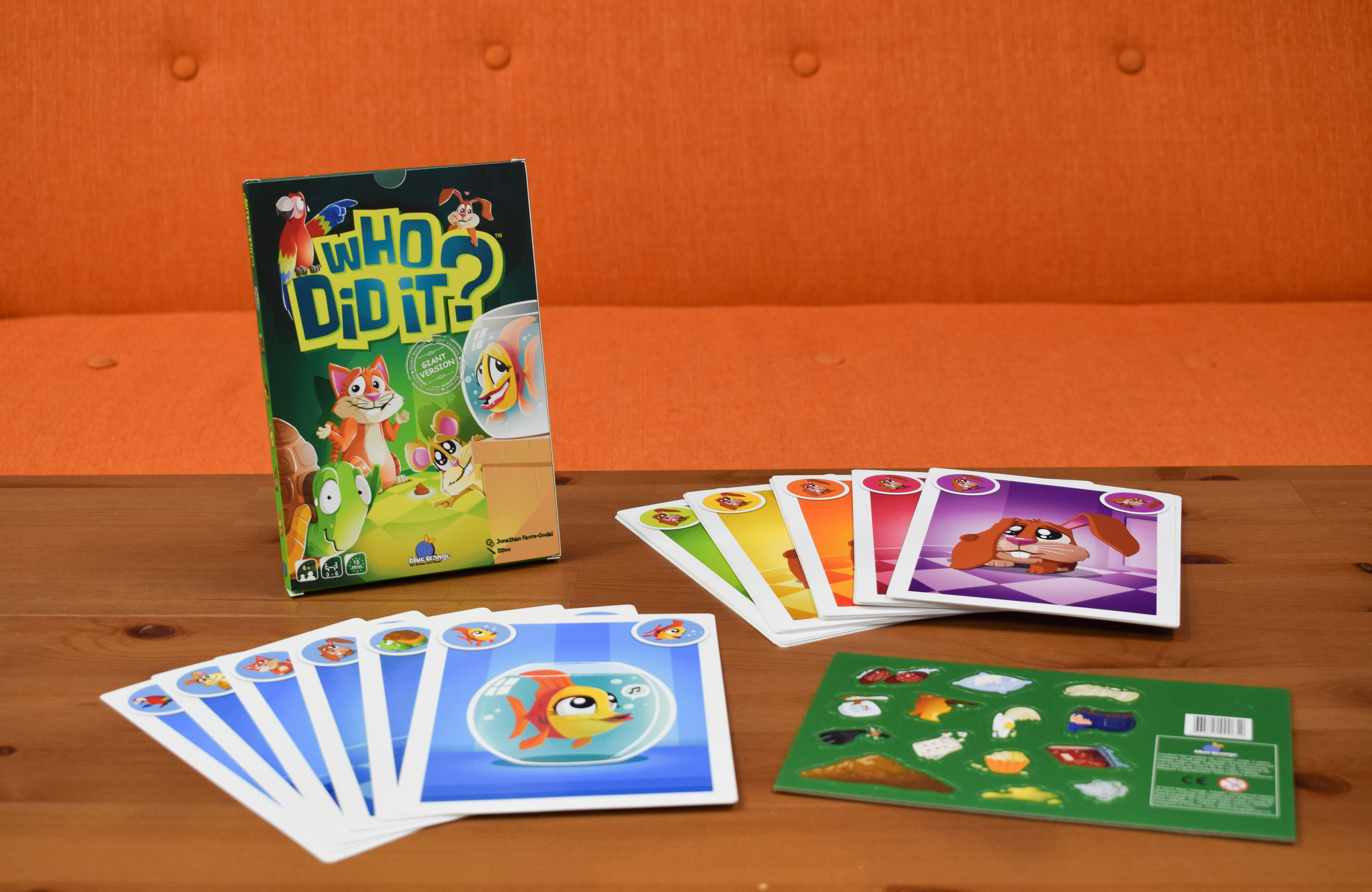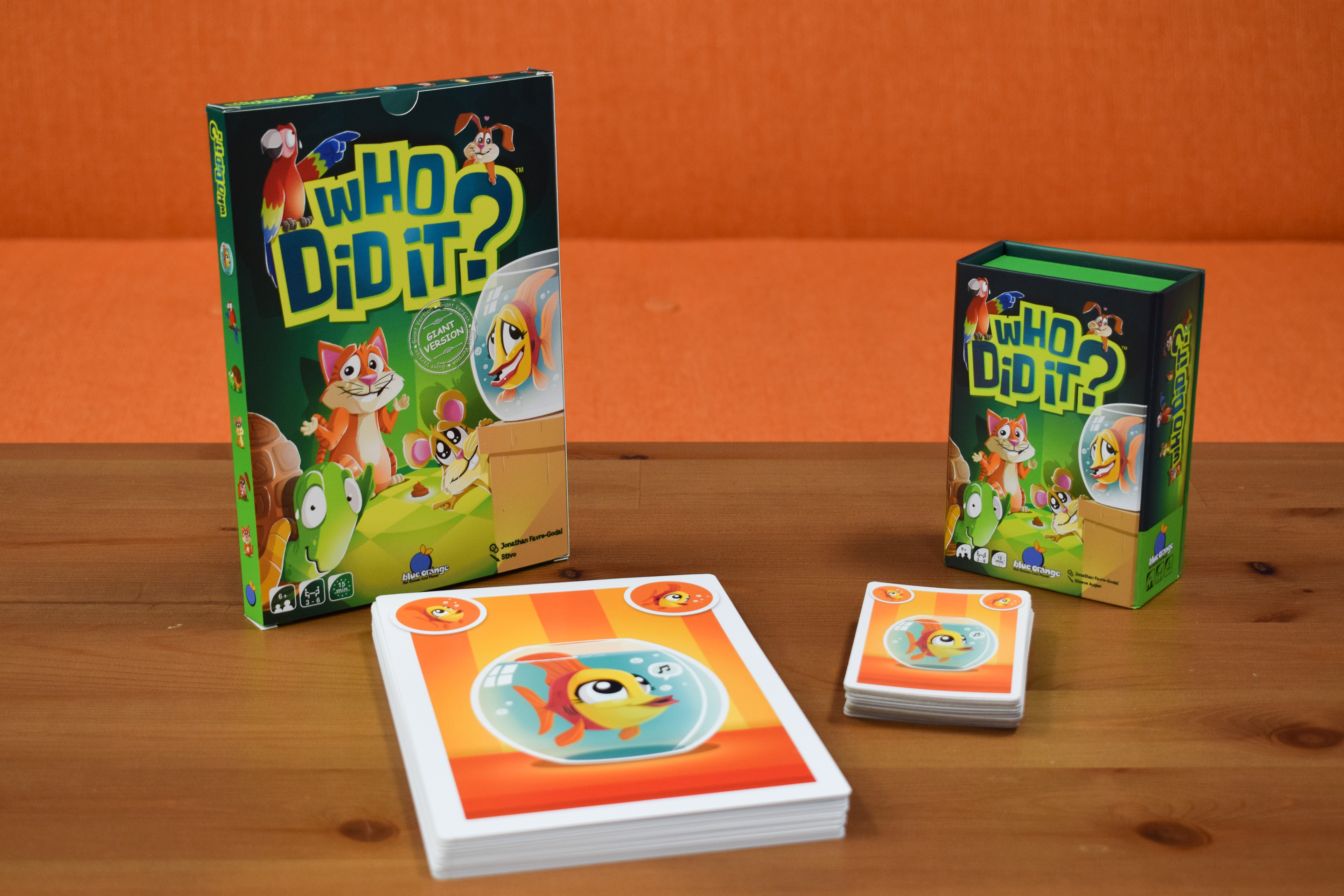 Who Did It? is a game by Jonathan Favre-Godal, illustrated by Stivo, published by Blue Orange. In this card game of speed and memory, you have to prove that your pets are innocent and accuse another one of being the one who pooped in the living room! To vary the pleasure, I created and get into production an official giant version of the game, which is sold worldwide by Blue Orange partners.